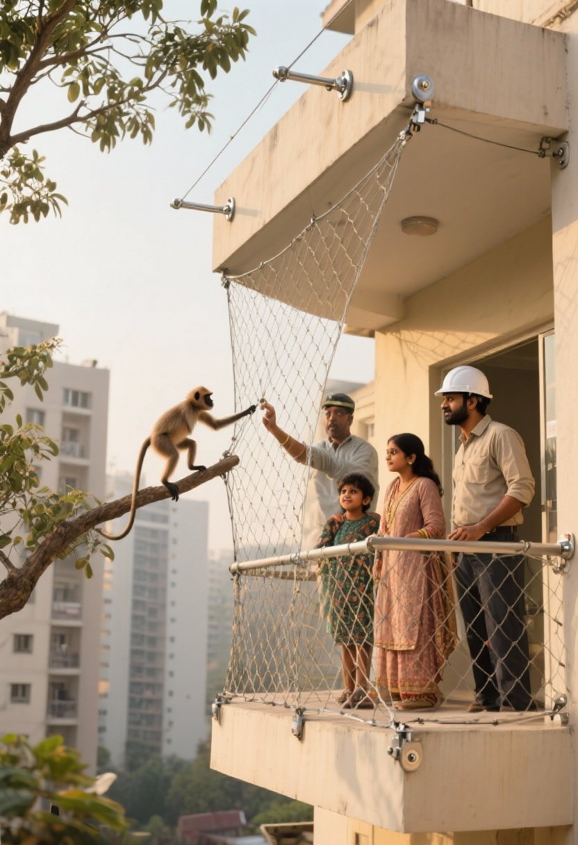 Monkey safety nets are strong, weather-resistant nets fixed around balconies, windows, terraces, or open areas to prevent monkeys from entering. They act as a protective barrier while still allowing air and light to pass through, keeping your home secure without blocking ventilation.